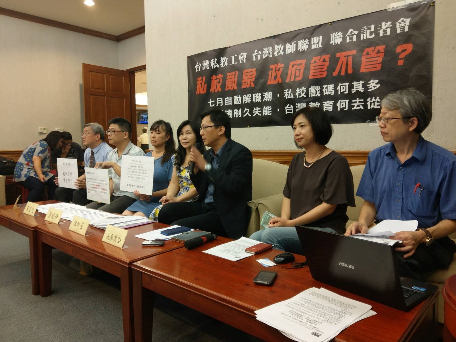 台灣私教工會與台灣教師聯盟13日記者會上向立委張廖萬堅、何欣純大吐苦水,表示私校主管機關對於董事會過於信任,怠忽職守,導致董事會以各種巧立名目的方式不合理縮編人力,私校教師不像公立學校受法律保障,常常求助無門。